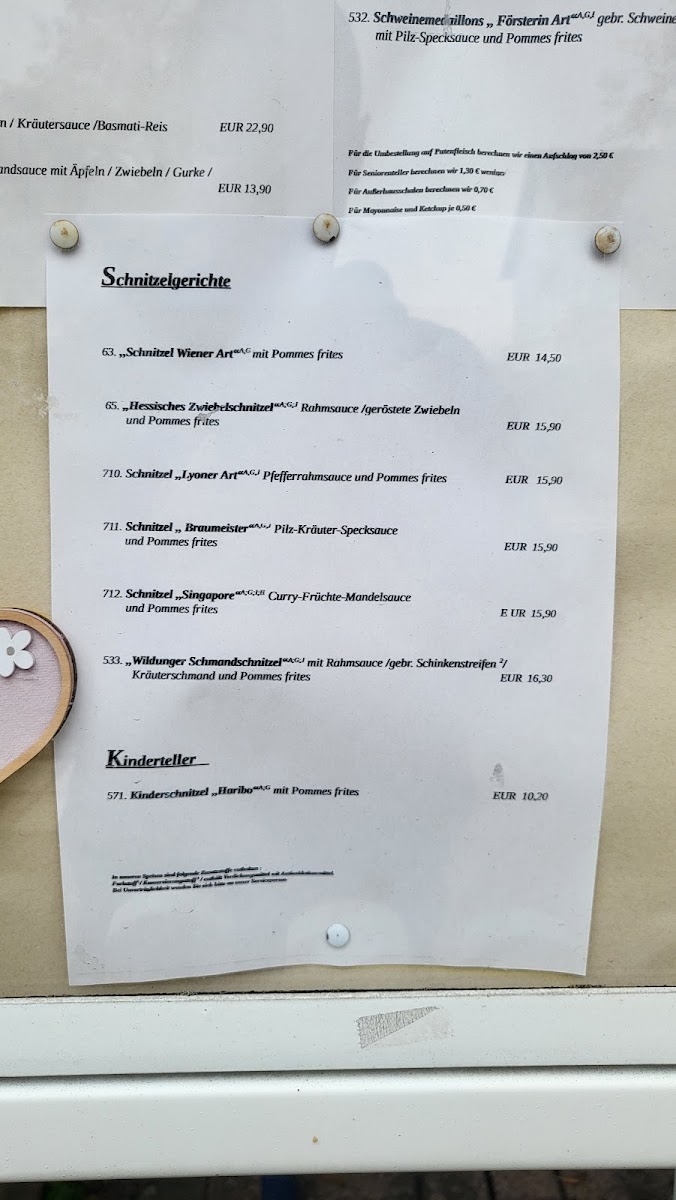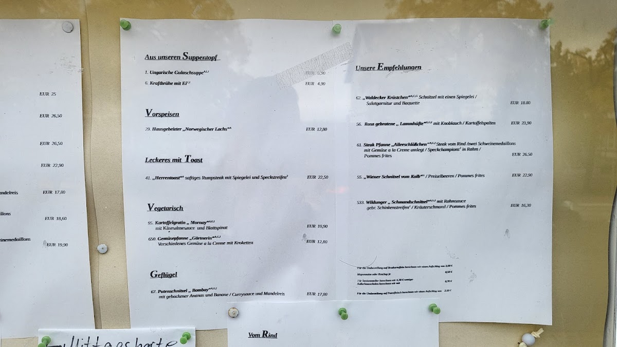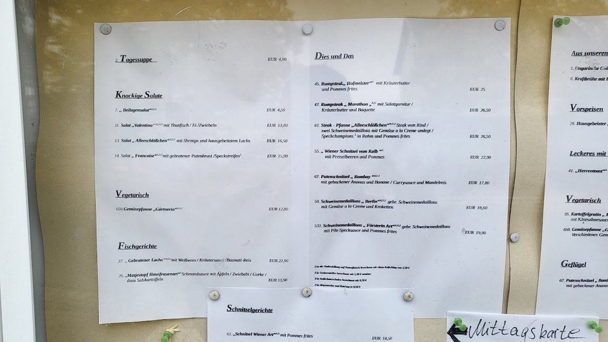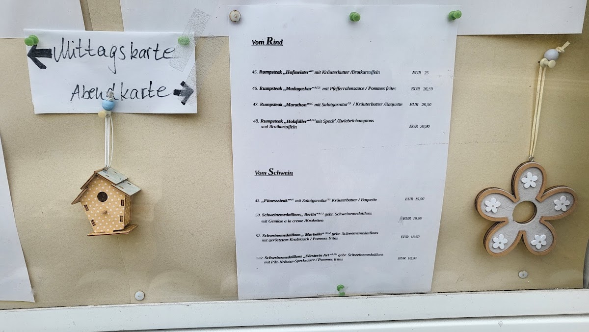 The food offerings include classic German café dishes such as Schmandkuchen (a type of cream cake), Holsteiner Schnitzel, and Schweinefiletmedaillons with mushrooms, illustrating a focus on both sweet and savory options. Desserts and cakes play a notable role on the menu, supported by customer feedback highlighting items like Apfel Eierlikör Kuchen and Bratapfel Kompott (baked apple compote).